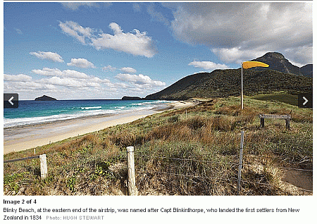Note the wind sock, indicating the beginning, or end if taking off presumably, of the island runway. This appears to be a fairly level grass field.
